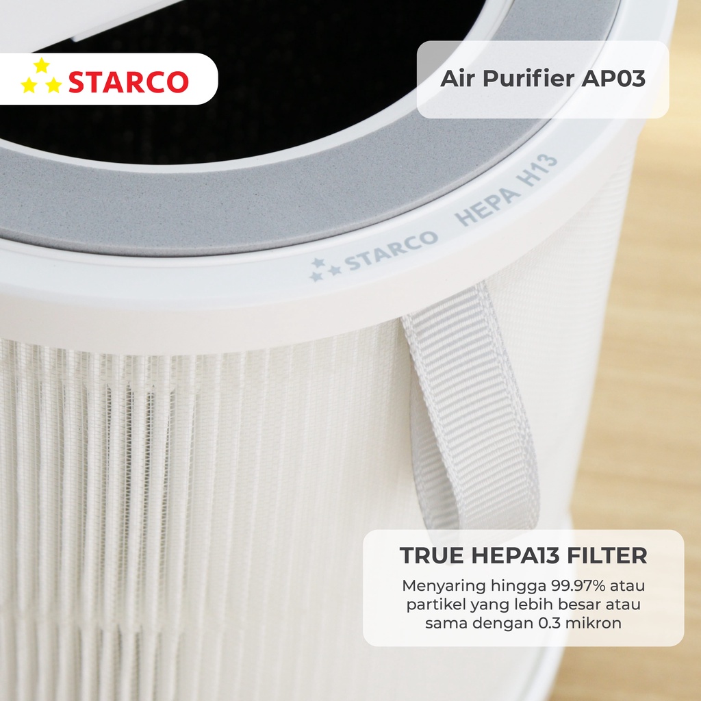 -TRUE HEPA FILTER - Menyaring dan membersihkan udara lebih optimal dan maksimal dengan Filter HEPA13 (menyaring hingga 99.97% atau partikel yang lebih besar atau sama dengan 0.3 mikron).